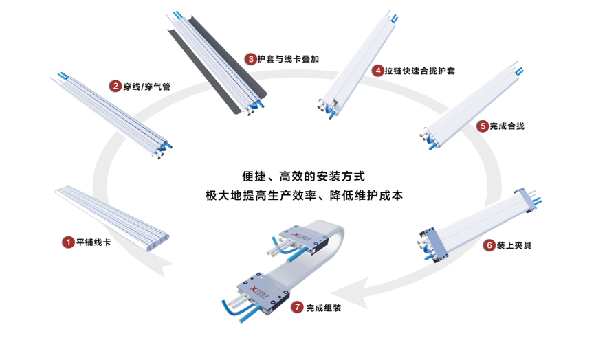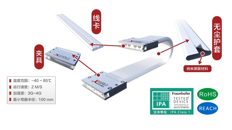 訊煜開放易安裝式無塵拖鏈(第3代屏蔽款無塵拖鏈)是一種滿足無塵環境下線纜防護及運動需求的產品,拖鏈自帶屏蔽抗干擾功能(內層采用納米屏蔽材料,吸收拖鏈內部線纜EMI竄擾)。易安裝式優于封閉式拖鏈結構,外層護套采用拉鏈開口式結構,便于線纜的安裝和更換。中間線纜由柔性線卡分隔和固定,提高線纜排布的速度和美觀度,同時減少線纜絕緣層的磨損,延長線纜的使用壽命。支持多層疊加,支持龍骨支撐,滿足長行程應用場景。