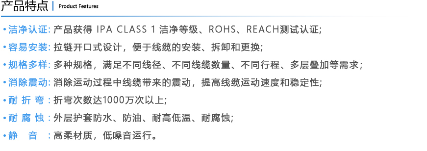訊煜開(kāi)放易安裝式無(wú)塵拖鏈?zhǔn)且环N滿(mǎn)足無(wú)塵環(huán)境下線(xiàn)纜防護(hù)及運(yùn)動(dòng)需求的產(chǎn)品,拖鏈自帶屏蔽抗干擾功能(內(nèi)層采用納米屏蔽材料,吸收拖鏈內(nèi)部線(xiàn)纜EMI竄擾)。
