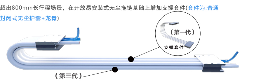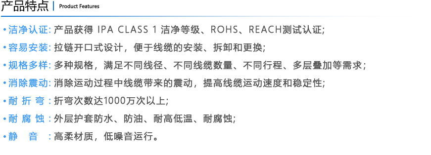 易安裝式優(yōu)于封閉式拖鏈結(jié)構(gòu),外層護(hù)套采用拉鏈開口式結(jié)構(gòu),便于線纜的安裝和更換。中間線纜由柔性線卡分隔和固定,提高線纜排布的速度和美觀度,同時(shí)減少線纜絕緣層的磨損,延長(zhǎng)線纜的使用壽命。支持多層疊加,支持龍骨支撐,滿足長(zhǎng)行程應(yīng)用場(chǎng)景。